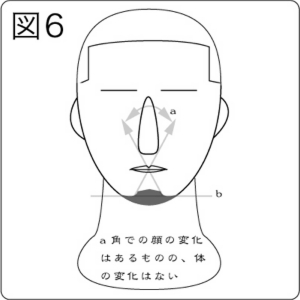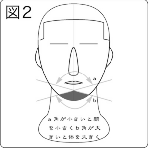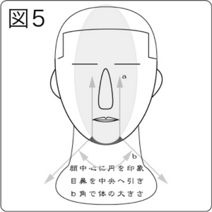 このスタイルは、精悍な印象がデザインされます。横幅は顎の大きさを助長するので力強さをか ねたデザインが可能です。三角形頂点の位置により顔の中心線を導く事ができますので、輪郭矯 正のデザインが可能です。頂点の延長上には眉間を基本にすると導きやすいでしょう。鼻の状態 によっては矯正が可能です。三角形の角度の延長線上ラインのa角は顔上部の大きさを、b角は身 体の大きさを印象づけますので、相互のバランスが必要です。あまり角度を急なものにしてしま うと、顔がひじょうに細い印象を助長するために注意が必要です。その際は頂点部分を横にとっ てしまって台形にする事により、効果を和らげる事が可能です。