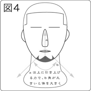 「複合的な形状デザイン〜O型(図5)」O型とは顎鬚中央部が凹み、両脇角がでている状態にな ります。このスタイルは、その形状から中央部に丸いO型をイメージさせることができます。こ のイメージにより、丸い顔の形状をデザインをします。顔に柔らかい印象を与えますので、痩せ ている方にはお勧めです。ただし場合によっては丸顔を助長したり、縦方向に顎を長く印象づけ てしまうなどの事があるので注意が必要です。両脇の角の長さ(a)によりO型をさらに印象づけ 、角度(b)によりO型の大きさをデザインできます。 ヒゲを構成する部位が少ないために、顎 の鬚が薄い方などにもデザイン可能なのも特徴です。 ヒゲの薄い方や、あまりヒゲを大袈裟に デザインできない方にも良いかと思われます。