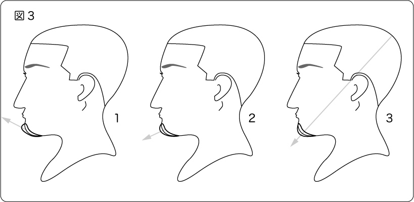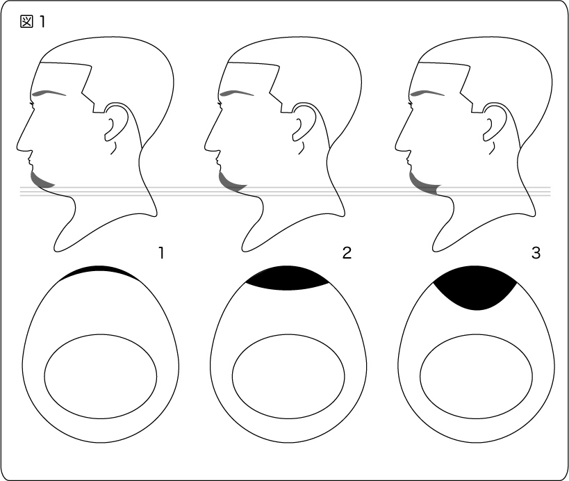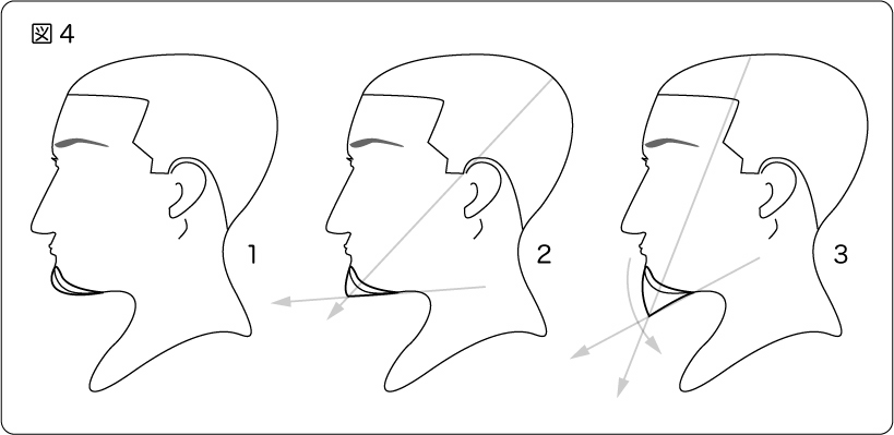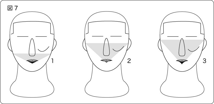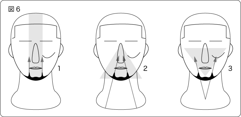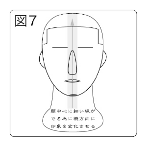 鬚幅と鼻筋を結ぶデザインベルトにより、顔を縦方向に変化させます。眉間、鼻、人中、顎まで のラインを直線的に印象づけるデザインをすることができます。ただし、眉間および左右の目頭 が離れている型の場合は、それを強調してしまうので注意が必要です。また細いデザインベルト は左右のスペースが空いてしまうので、顔の大きさを横に大きく印象づけますので注意してくだ さい。