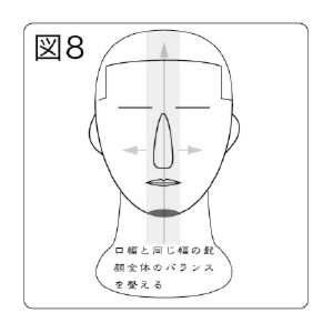 口幅と同じデザインベルトを印象づける事により、顔の安定感をデザインします。この幅は様々 な顔の形に応用できる基本的な幅と考えてください。眉間、目頭、鼻、人中、そして口までがデ ザインベルトの中に収まる事により、各部位のバランスを矯正する事ができます。