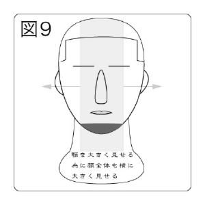 整然としたスタイルで、厳粛な印象がデザインされます。横幅は顎の大きさを助長するので、そ の幅により顎幅の大小をデザインする事が可能です。さらに四角という形から、男性的な印象を デザインするとこができます。逆三角形の顔形においては、頂点部位の印象を和らげる働きがあ ります。縦の長さは顎から唇までの3分2ほどまでが理想です。この型値からは口の表情を助長 しないために、寡黙な雰囲気を印象づける事ができます。a角が大きいと身体を大きく、顔の重心 は下になりがっしりとしたデザインになります。