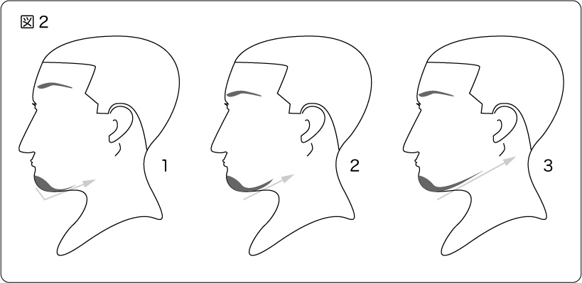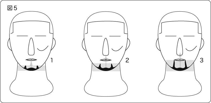 顎ヒゲデザインに関しては様々なデザイン定義があるものの、元々あるヒゲの 形(生え方)により決まることになります。顎ヒゲはデザインによって、上方向に対して顔を引き上げる効果があります。つまり、デザインによって小顔になるという事です。逆にいえば、顎 ヒゲによって顔を大きくみせている方がいかに多いという事ですね。顎ヒゲはデザイン次第によってワイルドな印象になったり、繊細な印象になります。ヒゲの長短によっても印象が変わるので、ヒゲに親しむには良いかと思います。顎ヒゲにはデザインをするうえで大きく分けて3つ の部位があります。それは「顎中心」「顎横」「唇下」の3つの部位になり、それぞれのデザインポイントを説明いたします。まずは「顎中心」部位の鬚形状を説明させていただきます。