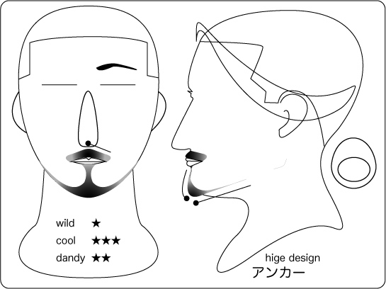 カコミ:アンカーに対して、口ヒゲがあるぶん男臭さが印象づく。また顎鬚左右の角の長さもあり、さらに大人の雰囲気が濃くなります。個性的なビジネスの場に向いております。