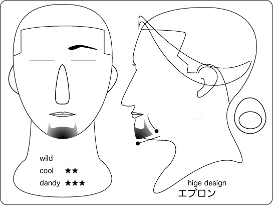 エプロン:ビジネスの場でも対応できる、大人のヒゲスタイル。顎鬚から伸びる左右の角のグ ラデーションが洗練された雰囲気をデザインします。