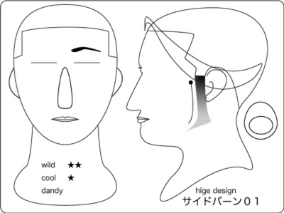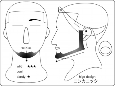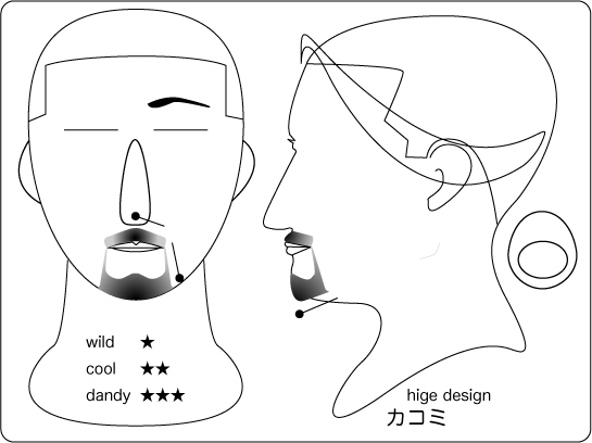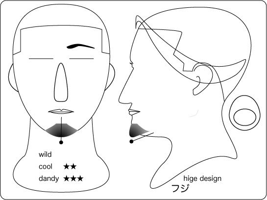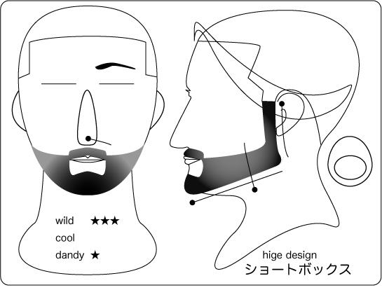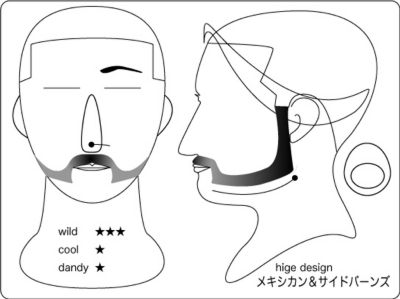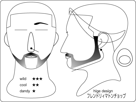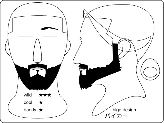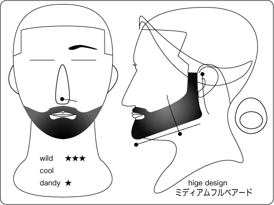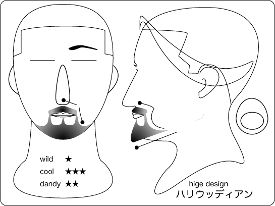 ハリウッディアン:顎を覆い隠すワイルドさもありつつ、サイドの鋭いグラデーションが精悍な 印象を与えます。丸と線で構成されたラインは、丸部位から長さが短くグラデーションしていき ます。そうする事により、強烈なイメージがありつつも大人な雰囲気を持つデザインとなります 。