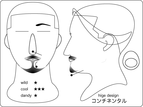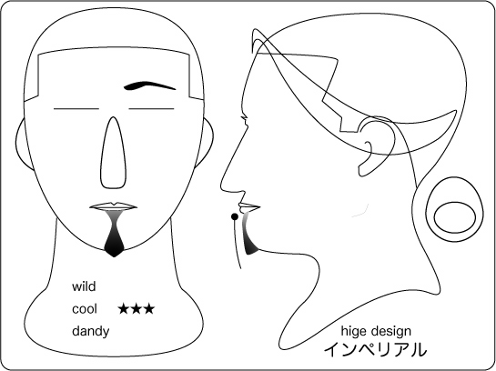 インペリアル:下唇のヒゲから、顎のヒゲへつなげていくスタイル。正中線を強く意識させる ので、精錬さらたイメージを与えます〜でも、その印象強さから公なビジネスの場には難しいデ ザインでもあるでしょう。