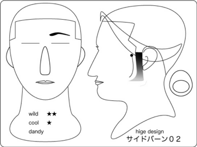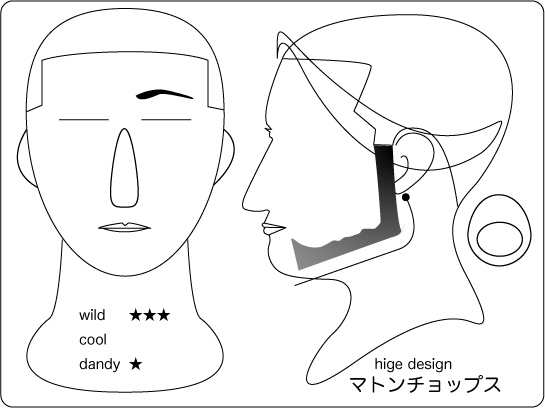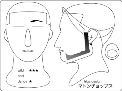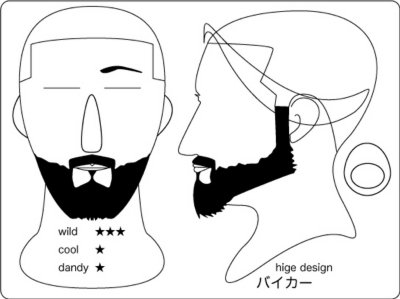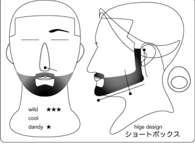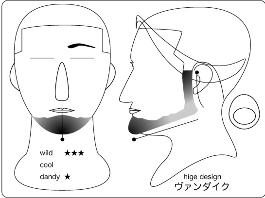 ヴァンダイク:顎を覆い隠すほどのヒゲと、太めのサイド部位が印象的。そのデザインは大きな 男を想像させ、男臭さを印象づけられる。個性的な事を業とする場合には良いが、公なビジネス には向かない。