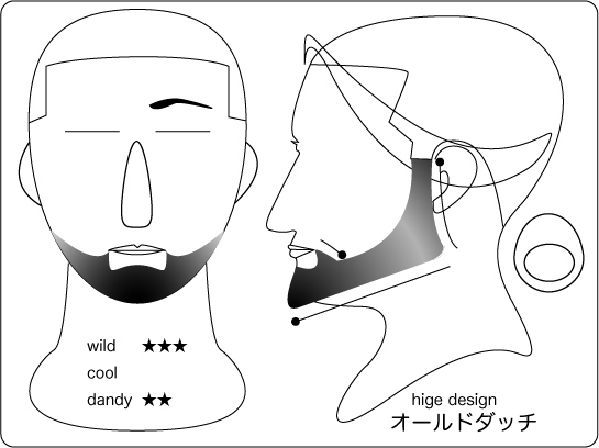 オールドダッチ:カストロスタイルをさらに男臭くしたデザイン。顎鬚下部の首部分をしっかり と切り揃えられるか否かで、イメージが大きく異なるので注意。