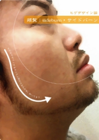 「髯(ほおひげ:sideburm )」は顔の輪郭でも、横顔を形成する事が可能なヒゲデザインでもあ ります。顎鬚とつなげる事により横顔を強調し、上方向のリフトアップが可能になる部位でもあ ります。ゆえに間違ったヒゲデザインをしてしまうと、顔のイメージがかなり変わってしまうの で注意が必要です。一般的にはヒゲは鏡の前で正面を向いてヒゲをデザインしますが、実際には 他人から観られるのは「横顔」であるのです。ゆえに「ヒゲのプロ」でもある理容店で行われる ヒゲデザインにおいては「横顔」を意識したヒゲをデザインしているのです。そのような事か ら「髯(ほおひげ:sideburm )」は大きなデザイン的な意味を持つ部位でもあるわけです。