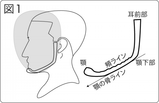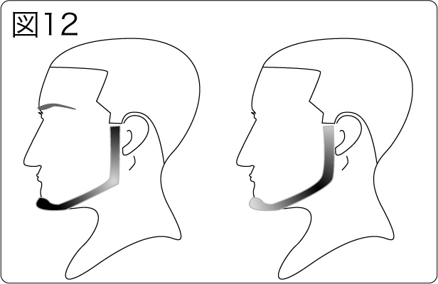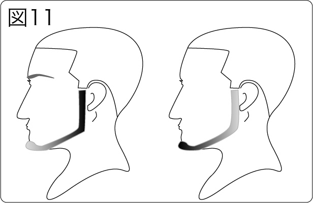 前部からゆるやかに顎下部に向けて降ろし、顎骨に剃って顎に伸ばした状態のデザインになり ます。耳前部〜顎下部〜顎を結んだラインは、そのまま正面の顔のアウトラインをデザインする ことができます。これは、そのデザインラインで顔を矯正する事が可能になるということです。 基本的なラインの特性ですが、首側となる顎の骨ラインにおいては、ワンシェービングおよびク ロスシェービングを施術してはっきりとしたラインで構成されます。 このラインを首側に下 げてしまいますと顔は下に下がりますので、注意が必要です。大体の場合は、顎の骨ラインより も首側にヒゲを生やしております。そのような状態では、本来の顔の大きさが顎の骨ラインまで なのに対して、首のほうまでヒゲがある為に顔が下方向に大きくなっているのです。そのときは 顎の骨ラインより下のヒゲは全て綺麗に剃り落してしまいます。