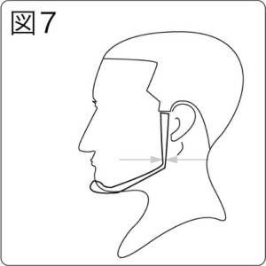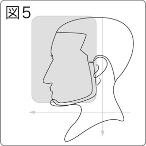耳前部〜顎下部〜顎までのラインのうち、顎下部の位置を前方にづらしたアウトラインになり ます。耳前部から顎下部のラインが前方に描かれるために、顔の厚みが感じられないイメージ になっております。一般的に正面から鏡を観ながら鬚をデザインしている為に、意識せずにデザ インされいる場合があります。顔の奥行きが西洋人に比べてないアジア系の顔つきの場合には、 余計に顔の奥行きの無さを助長してしまいます。また顎も細くなってしまうイメージになる為に 、注意が必要です。お客様がこのようなデザインで来店された場合は、その印象を正確に伝える 事が大切になります。その上で標準的なデザインに近づける為、耳前部〜顎下部〜顎までのライ ンを一旦剃り落します。それが無理な場合は、数回の施術に分けて少しずつ外側にラインを移動 していく事を提案すると良いかと思われます。