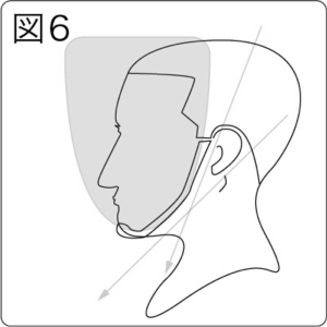 前部は頬骨方向に前に突き出し、さらに顎下部方向にラインが下がるデザインです。ラインが一 度突き出して下がる事により、顎を後方に引き締めた印象を与えるデザインです。ラインの角度 変化によっても、様々な印象変化を促す例となります。顎を後方に引き締めたデザインですので 、顎がしゃくれた状態(受け口状態)の方には有効になります。また姿勢が猫背の方などにも、 顎を引き締めさせるさせる事により有効になるでしょう。ただし顎を引き締めるという事は、格 闘家のような攻撃的な印象を与えます。顎を引き締める事により、目線が下から睨みつけるよう な印象になりますので注意が必要です。顎下部にむけてラインが下がるという事は、頬が顔下部 において大きくなる事でもあるので、顔下部が大きい方は印象を強くしてしますので注意してく ださい。顔の奥行きがない方の場合には、有効なデザインかと思われます。