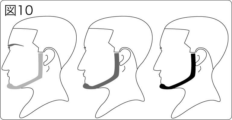 また顎下部から顎までの中間部あたりは、顎の骨ラインで剃ってしまうとなくなってしまう場合 があります。どうしても顎下部から顎にかけてのヒゲをしっかりと残したい場合は、顎の骨ライ ンよりも首側にラインを降ろすデザインも有効です。 ただしあまり下げすぎると顔が下がってし まうので、面長の顔の場合などには注意が必要です。あえて中間部分が無くなっても顎の骨ライ ンで剃り落した場合でも、顎と顎下部のヒゲがあればデザイン的効果はあります。あまりワイル ドな感じにデザインしたくない場合などでは、あえて中間部分を薄くしてしまう事も有効になります。