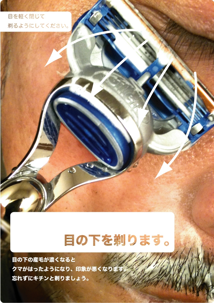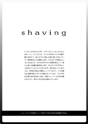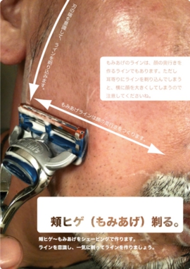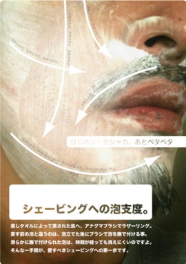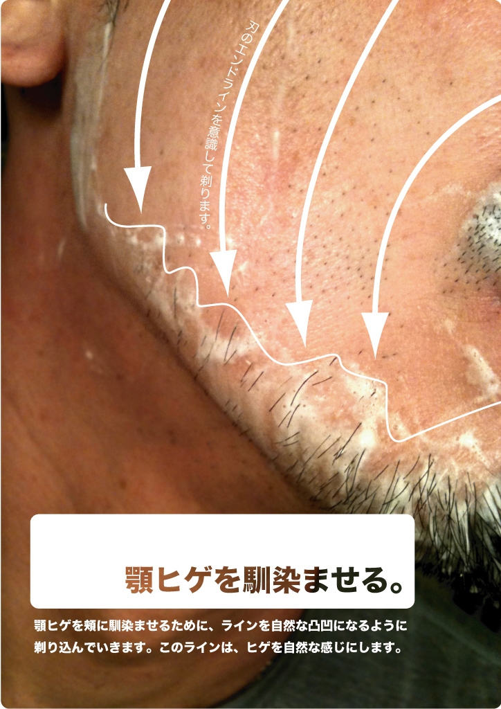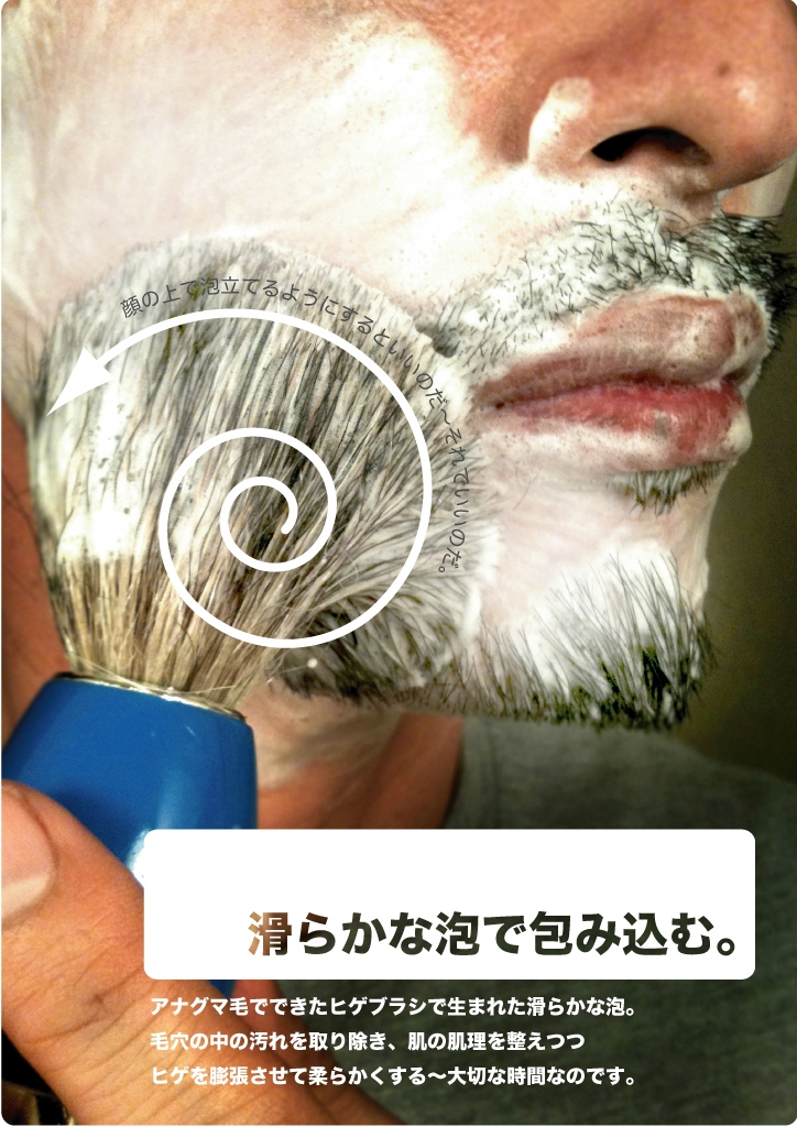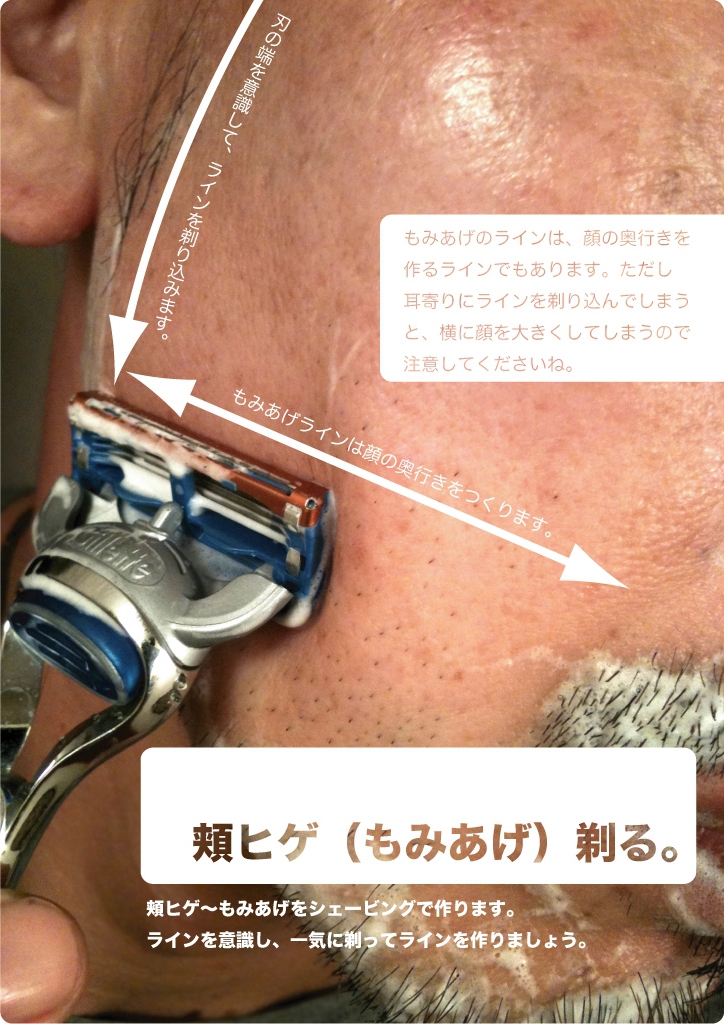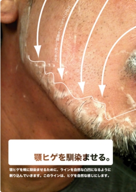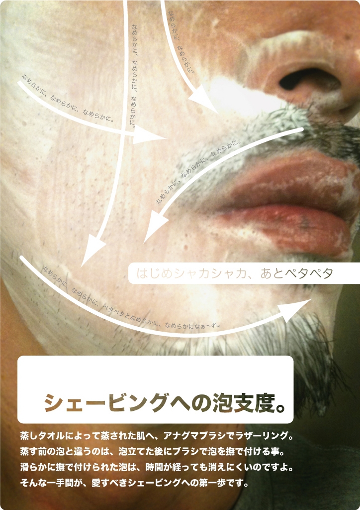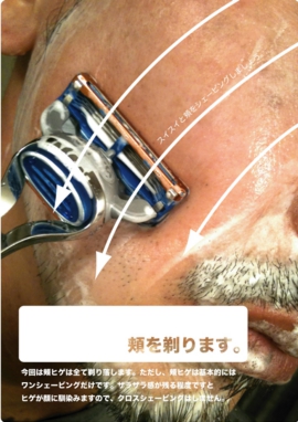 shaving;シェービング〜顔剃りです。トリミングされたヒゲをレザーでシェービングいたします。シェービングは、アナグマの毛ブラシで石鹸で泡をたて、蒸しタオルで蒸した後に鋭い刃のレザーで、顔を作ることを意味します。それはヒゲを剃るということ以外にも、毛穴の汚れや古い角質を除去して、新しい肌への新陳代謝を促します。それはシワができにくい肌をつくりことにもなります。剃刀負けしてしまう人は、切れ味が落ちた電気シェーバーの刃を交換すると共に、剃刀との共用をお勧めいたします。