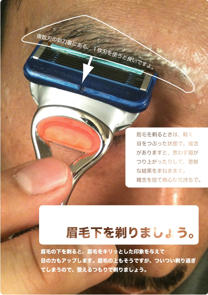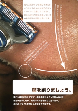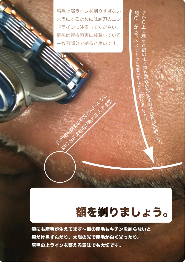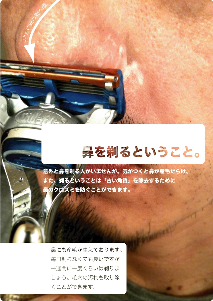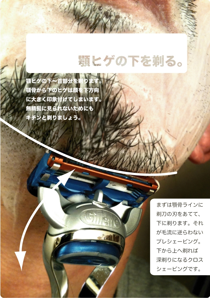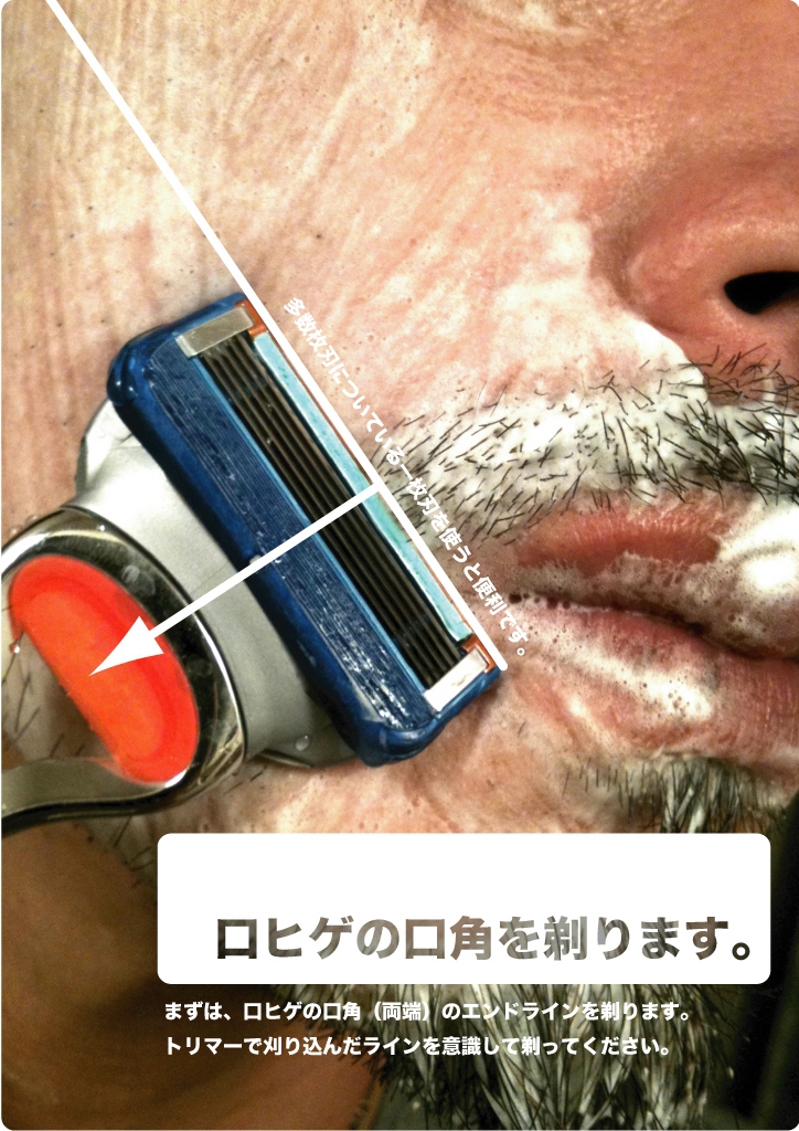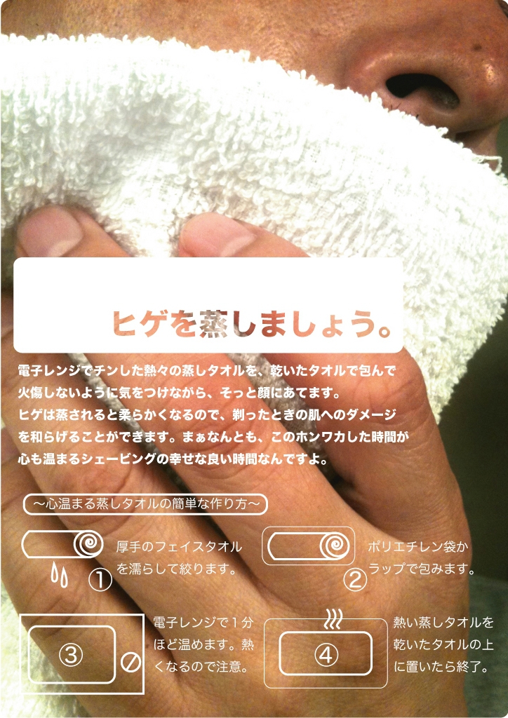 shaving;シェービング〜顔剃りです。トリミングされたヒゲをレザーでシェービングいたします。シェービングは、アナグマの毛ブラシで石鹸で泡をたて、蒸しタオルで蒸した後に鋭い刃のレザーで、顔を作ることを意味します。それはヒゲを剃るということ以外にも、毛穴の汚れや古い角質を除去して、新しい肌への新陳代謝を促します。それはシワができにくい肌をつくりことにもなります。剃刀負けしてしまう人は、切れ味が落ちた電気シェーバーの刃を交換すると共に、剃刀との共用をお勧めいたします。