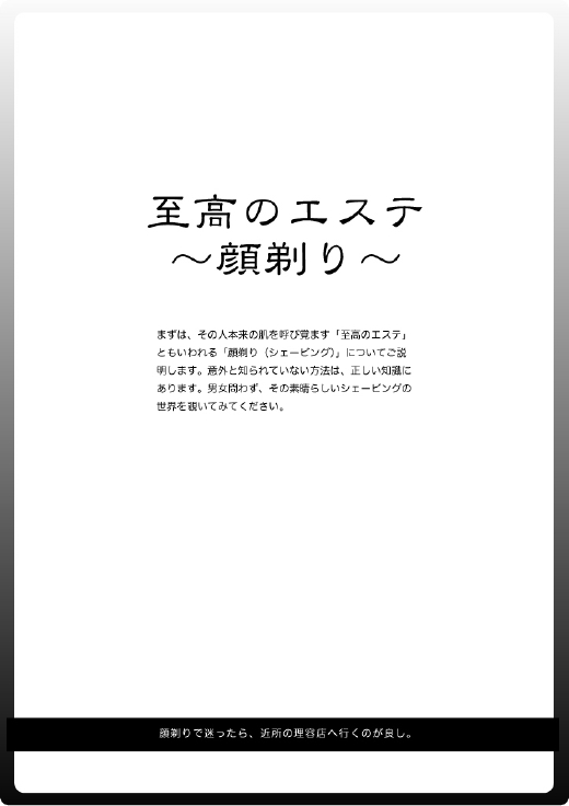 それが「至高のエステ」と言われる「顔剃り(シェービング)」の魅力のひとつです。剃り終え た肌は、古い角質を除去して新しい肌を世にだし、肌に刺激を与える事によりシワのできにくい 肌を作り上げられているのです。そして、歳を重ねた時に喜びとなるはずなのです。