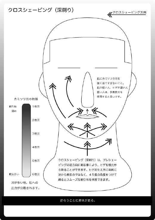 男女問わず肌から突出しているヒゲを取り除くわけですから、肌へのダメージを考えなければな りません。それはスキンケアということだけでなく、取り除く・・つまり、剃る/刈るという事で 、使用する刃の切れ味や用途などが問題になってきます。その道具に求める仕事と、切れ味など のメンテナンスも大事です。さらに、その前段階では、ヒゲが肌へダメージを残すことなく剃り 落す為の事前処置も大事になってくるのです。それら何かを怠っても、「シェービング」という 行為は成立しません。それらを踏まえた上で「シェービングライフ」を楽しんでいた だきたいと 思います。